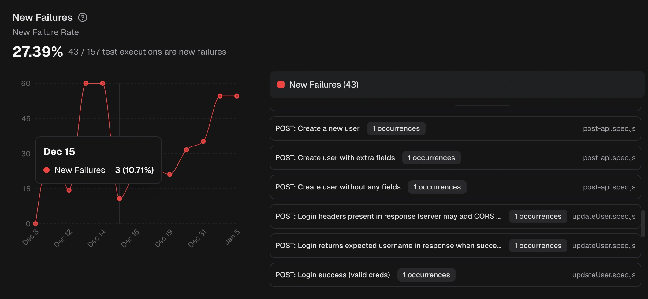 Measures the percentage of test executions that are failing for the first time compared to previous runs.A list of the New Failures on the right shows the name, spec file, and execution date for every newly failed test.Use it to detect regressions early: