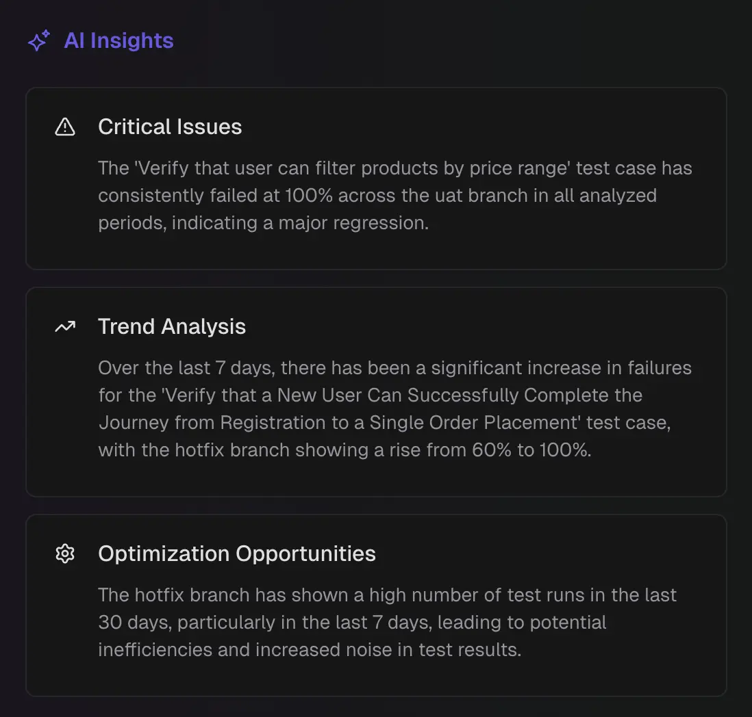The QA Dashboard includes two AI-driven panels that explain failures and highlight patterns for the selected period, environment, and branches.