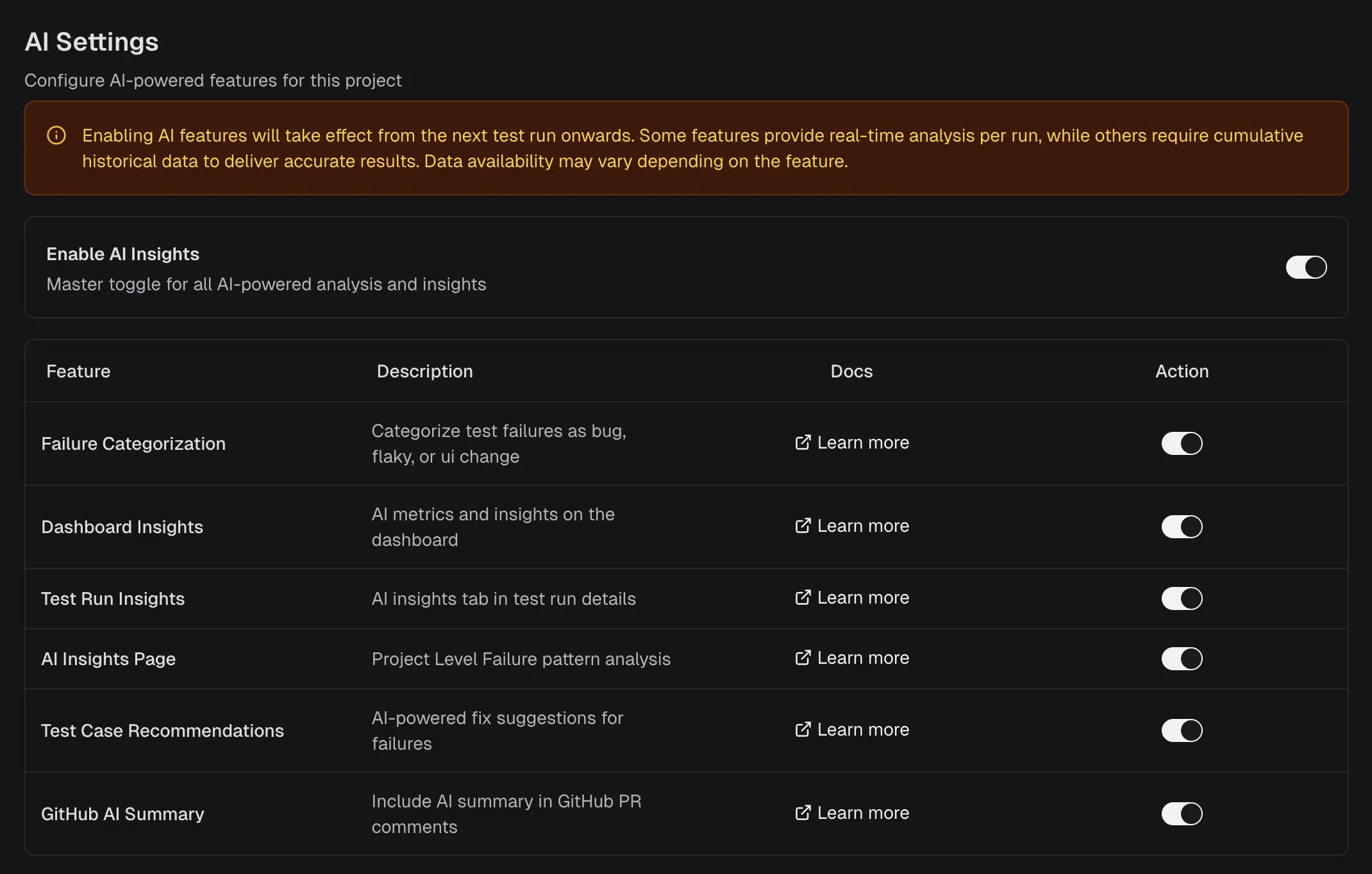 Disabling an AI feature does not affect other platform functionality. Test execution, reporting, and all non-AI features continue to work normally.