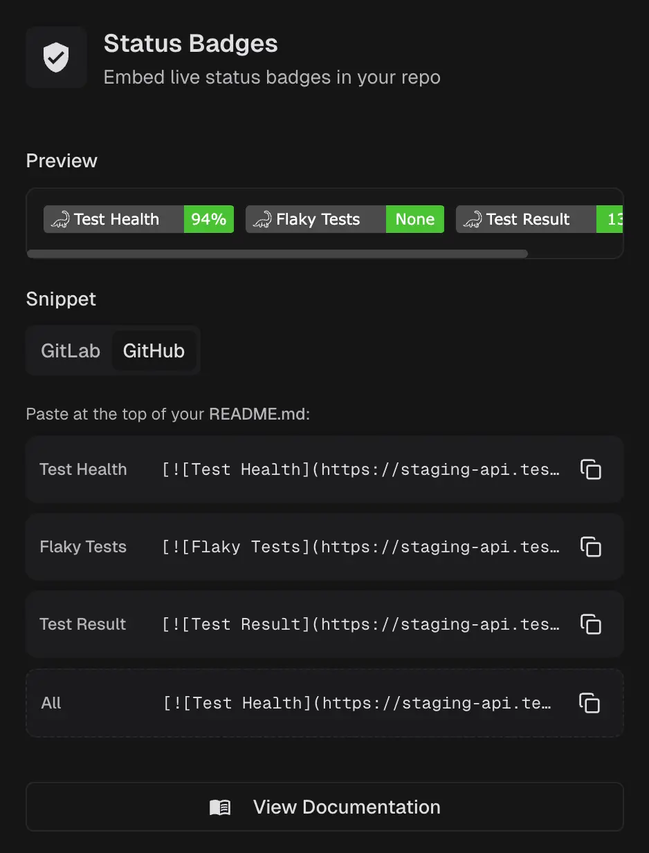 Embed live SVG badges in GitHub or GitLab READMEs that display test health, flakiness, and test counts from the latest completed run. Configure badges from Integrations → TestDino Add-ons → Status Badges.