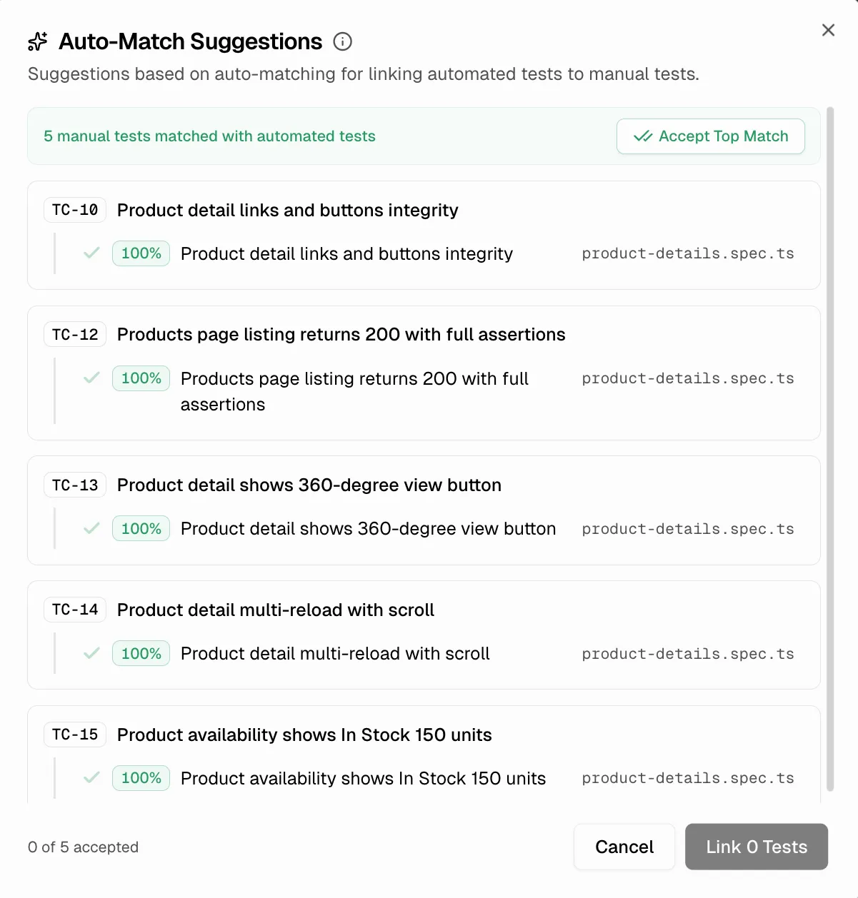 - Click Accept Top Match to accept the highest-scoring match for every test case at once.