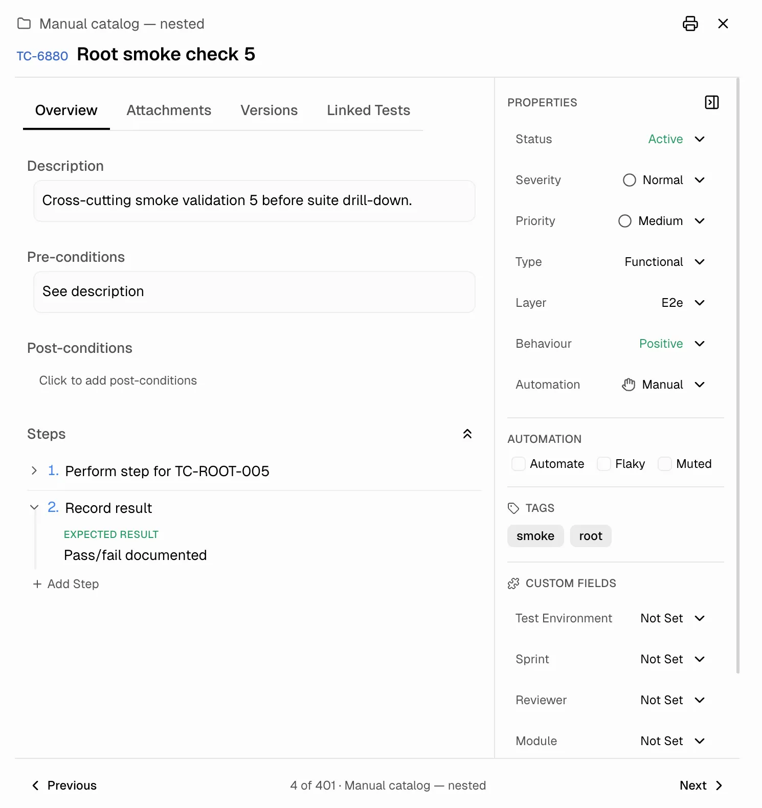 The main view of the test case. All fields are editable inline — click any field to modify it.| Section | What It Shows |