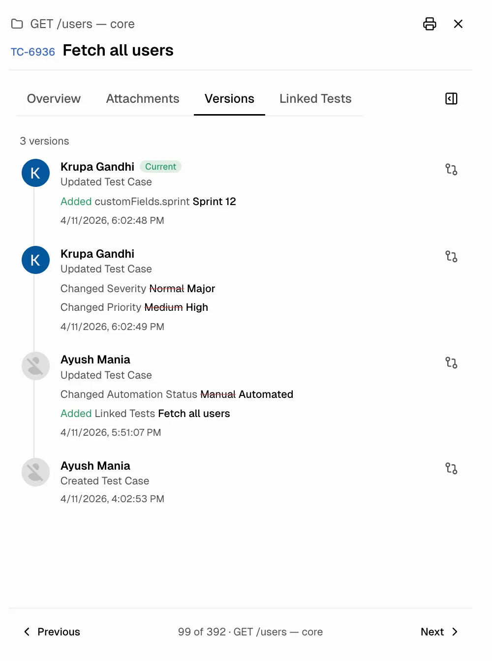 | Previous / Next arrows | Navigate between test cases in the current list |